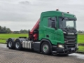 Number of axles: 3, Configuration: 6x4, Own weight: 103780 kg, Gross vehicle weight: 26000 kg, Total fuel capacity: 500 litre, Trailer coupling, Kingpin size: 40 DIN, Fifth wheel height: 130 cm, fifth-wheel: Slide, Diff. locks: 2, Suspension type: air suspension, Cabin type: Highline, Cruise control, Tacho, Digital tachograph, Airconditioning, Parking heater, Electric windows, Electric mirrors, Radio/cassette, Carplay, GPS navigation, Color: Green, Heated mirrors, Lighting type: Led lamps, Speed limiter, Laneassist, Climatecontrol, Seat heating, Bluetooth, Blind spot sensor, Flashing lights, Engine capacity: 331 Kw (444 Hp), Fuel type: diesel, Euro: 6, Gearbox kind: Opti-cruise, Gearbox make: Scania, Speed limiter, Number of Gears: 12, Add. break system, Retarder make: Scania, Power steering, ABS, ASR, PTO, PTO type: 1, Starter battery, Pump, Central locking, Seat cover: cloth, Chair adjustment: Manually, Crane, Crane make: HMF 2320, Year crane: 2023, Capacity crane: 23, Maximum load: 490 kg bij 21,5 m, Number of supports: 2, CE-approved, Control position: side control left, Remote control, Crane position: Behind the cabin, Hydraulic extendable: 8 times, Extra hydr. conn.: none, Hook, Crane winch